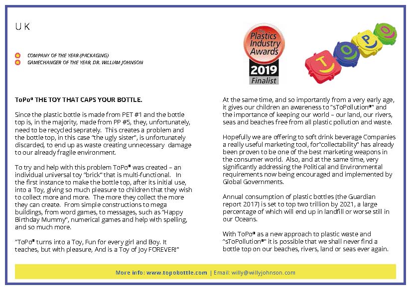 "We created a plastic bottle screw top that converts, after its original use, into a 'collectable' toy that is both fun and educational, in which children can construct, (Lego like) any amount of different structures, and play both word games and numerical puzzles or make messages and thus stopping the “throwing away” element. The ToPos are fully recyclable," Mr. Johnson explains.
